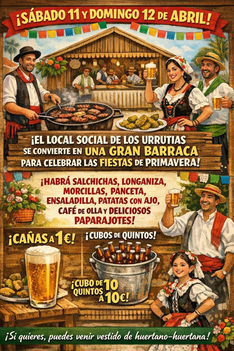 La novedosa celebración, que incluirá barraca, tendrá lugar este próximo fin de semana en la terraza del local social de Los Urrutias y se propone a los asistentes que vayan vestidos con vestuario huertano. En el capítulo gastronómico, se venderán morcillas, longaliza, panceta, patatas con ajo, café de olla y paparajotes, entre otros productos, fijándose el precio de las cañas a un euro.