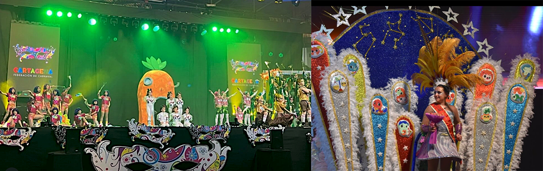 La comparsa de El Algar lució vestuario de 'chupas' de cuero negro y otros distintivos del mundo del rock en el desfile inaugural de la gran fiesta carnavalera en la ciudad de Cartagena, cuya celebración se prolongará hasta el día 17 de febrero.