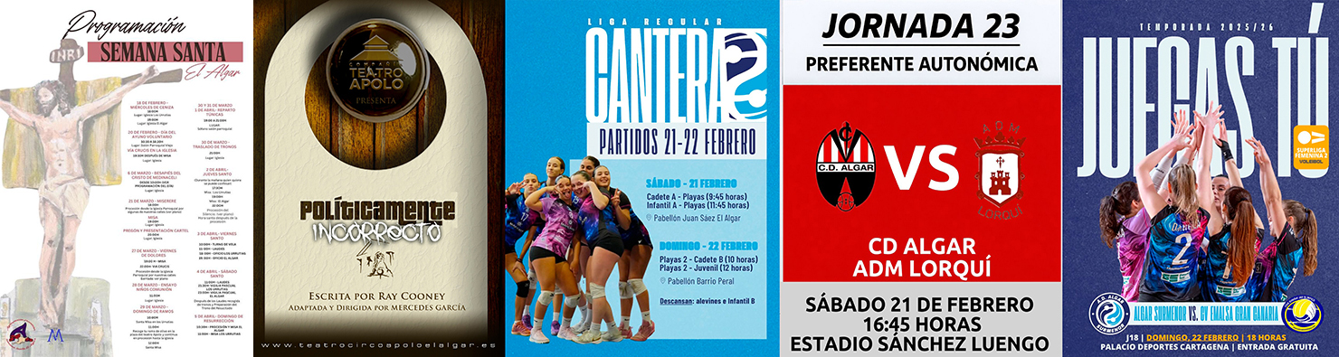 La 'Agrupación procesionista Semana Santa de El Algar' da a conocer la programación de cuaresma y de Semana Santa de este año, que arranca esta tarde con las eucaristías del 'Miércoles de ceniza' en Los Urrutias y en El Algar, culminando el 5 de abril con la novedosa procesión de la resurrección de Jesucristo por las calles algareñas. Besapiés del Medinaceli, día del ayuno volunario, miserere con procesión, pregón, presentación del cartel, vía crucis y el traslado de tronos son algunas de las actividades, además de misas y de los desfiles pasionarios.
