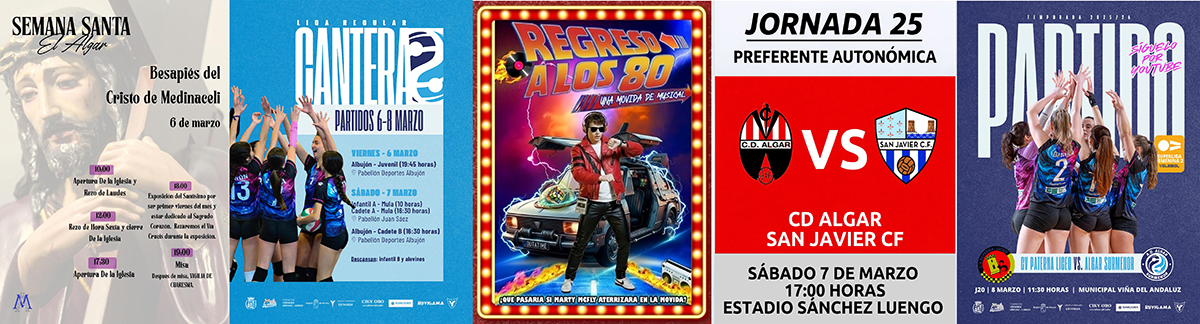La actividad ya está en marcha con la jornada de besapié al Cristo de Medinaceli en la parroquia de Nuestra Señora de los Llanos, mientras que en la costa hay rezo de vía crucis en la iglesia del Carmen. El sábado es el turno del musical 'Regreso a los 80' en el Teatro Circo Apolo, mientras que en el deporte ese día juega en casa el CD Algar, del que ofrecemos también los partidos de su cantera, al igual que los compromisos del CD Los Urrutias y CB Sierramar de baloncesto y del voleibol, tanto de las bases (el juvenil juega esta tarde en El Albujón) como del primer equipo, que tiene un complicado partido en la valenciana pista de Paterna el domingo.