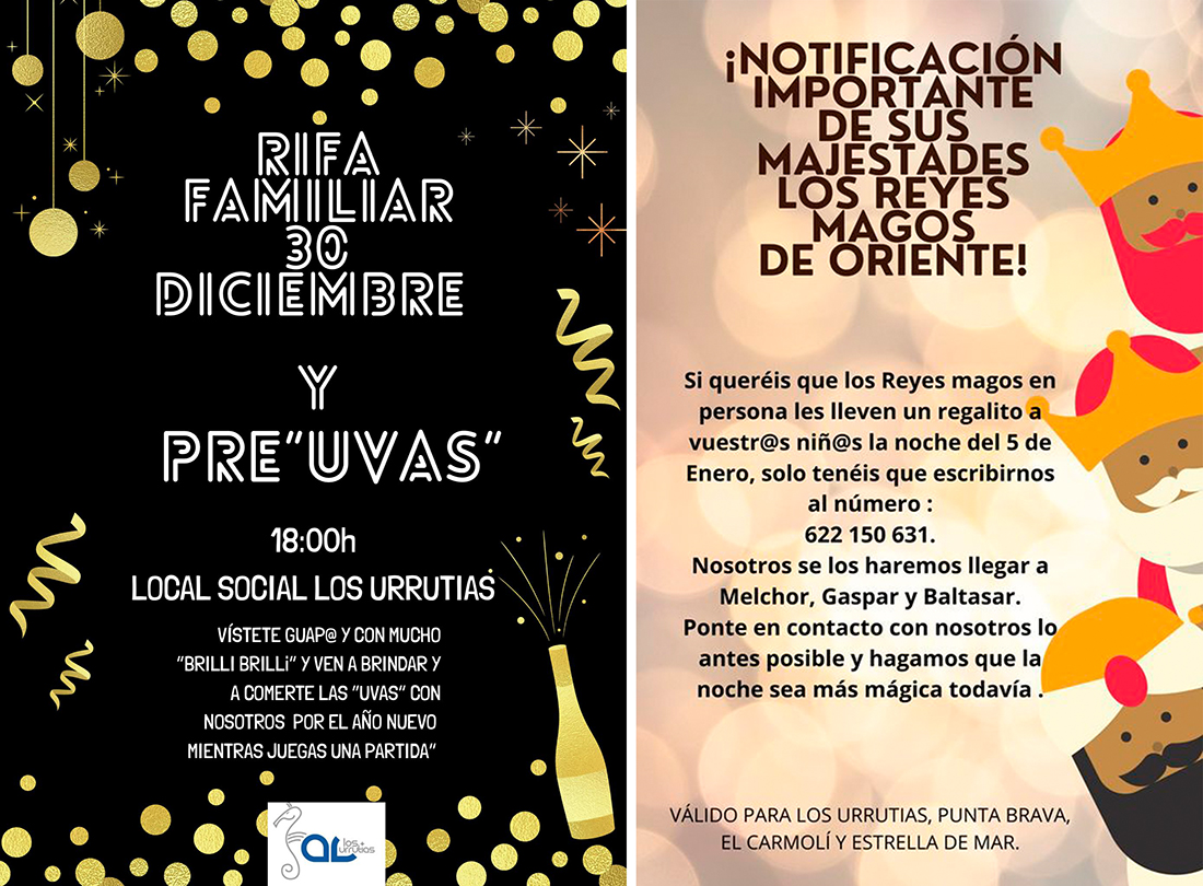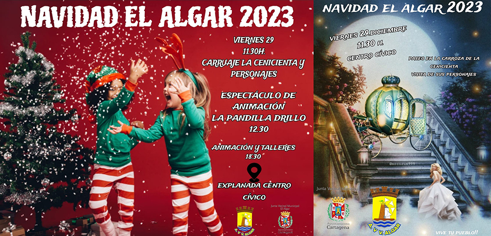 El Algar, además de la gala de magia de esta noche, ofrece para esta mañana paseos en carruaje y la visita de ‘La pandilla ‘de Drilo’, mientras quepor la tarde hay talleres. El sábado cogen el protagonismo (17 horas) los bailes de 'Doble D' y 'MarDance' junto a las preuvas infantiles’, mientras que en Los Urrutias hay rifa familiar y ‘Preuvas’ para despedir el año desde las 18 horas. Por otro lado, ya se puede contactar con el representante de los Reyes Magos en la costa del arco sur del Mar Menor para el reparto  de regalos en los domicilios.