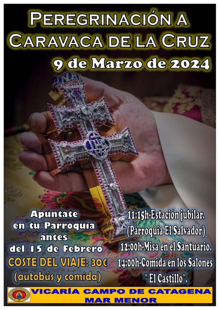 Las parroquias de Nuestra Señora de los Llanos de El Algar y de Nuestra Señora del Carmen de Los Urrutias informan que para el 9 de marzo se ha organizado, desde la Vicaría del Campo de Cartagena-Mar Menor, un viaje a la ciudad de la Región de Murcia de la Vera Cruz. El precio es de 30 euros (incluye autobús y comida), estando abierto el plazo para apuntarse hasta el 15 de febrero.
