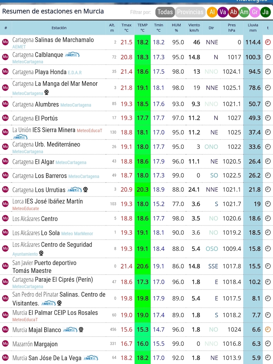 Ametse (Asociación Meteorológica del Sureste) ha publicado los datos de la estaciones climáticas de la Región de Murcia, onde se refleja que han caído 26,4 litros de agua por metros cuadrado en El Algar y 21,8 en Los Urrutias.