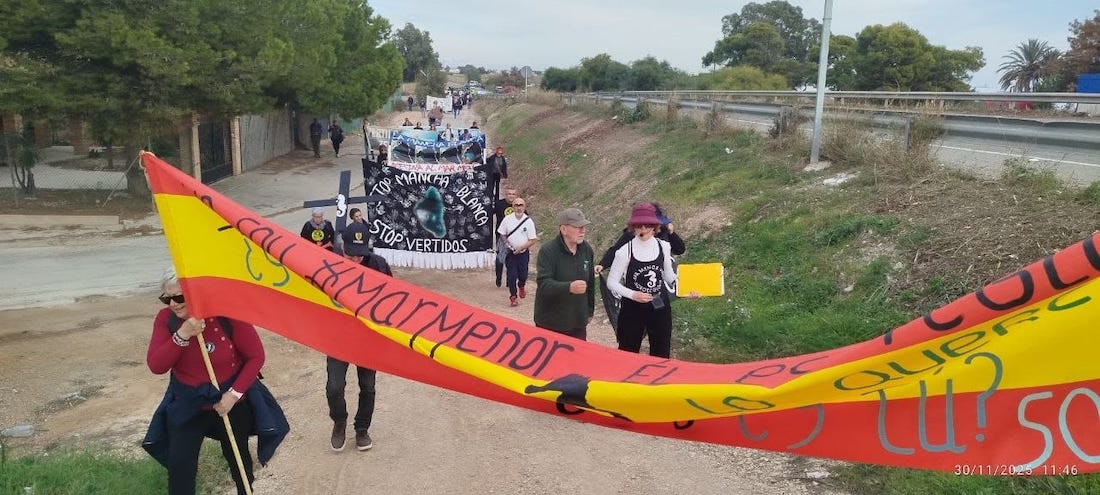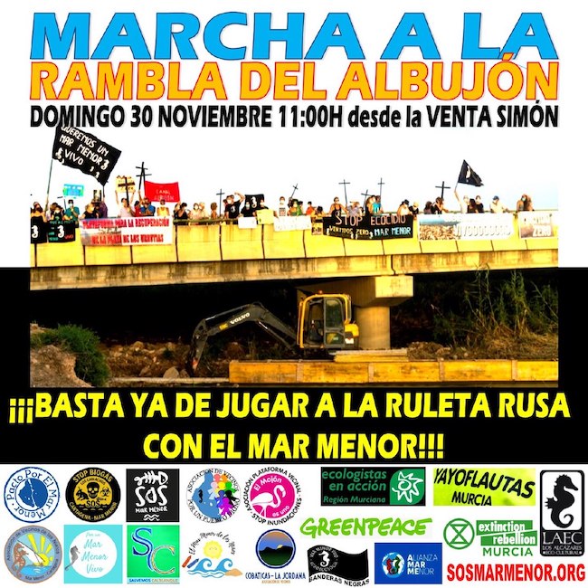 En el manifiesto, recordaron que el cauce fue desviado a conciencia en Fuente Álamo, siendo el caudal medio de 300 litros por segundo. Se piden medidas también contra la agricultura, a la que se sigue señalando como principal causante de la contaminación de las aguas que vierten en la laguna salada. La marcha comenzó en la venta de San José y culminó en la desembocadura de la rambla de El Albujón.