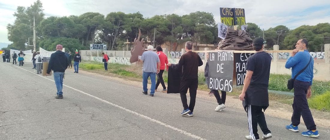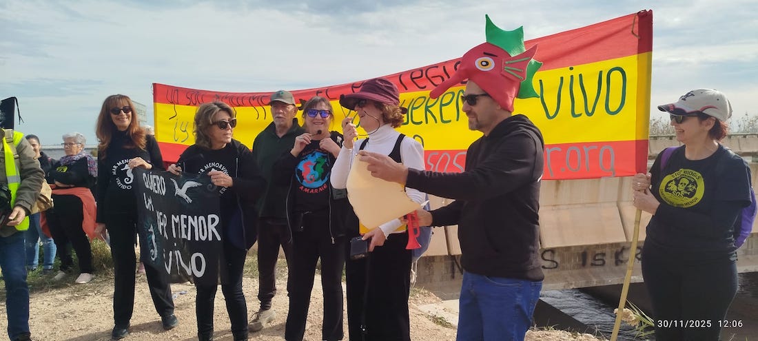 Fue uno de los cánticos que efectuaron las cerca de un centenar de personas que participaron en la marcha anual convocada por 16 colectivos para reclamar más protección para el Mar Menor y su cuenca, frenando la llegada de vertidos contaminados. Este año se suma la oposición a que se instale la marcroplanta de biogás en Los Camachos, lo que califican de "cagada monumental", pues afirman también dañará la albufera, además de residentes del entorno.