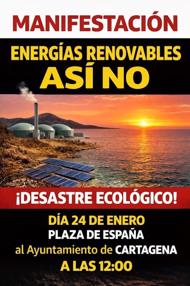 4. Los convocantes de la manifestación del 24 de enero en la ciudad de Cartagena aclaran que van a defender "un plan de ordenación del terreno para el Distrito 7 y una regulación de las distancias mínimas más coherente con las viviendas, con lo que afecta tanto a las plantas fotovoltaícas como a la macropalnta de biogás, entre otras instalaciones que puedan ser dañinas".
