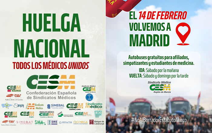 El Comité de Huelga formado por la Confederación Española de Sindicatos Médicos (CESM), junto al Sindicato Médico Andaluz (SMA), Metges de Catalunya (MC), la Asociación de Médicos y Titulados Superiores de Madrid (AMYTS), el Sindicato Médico de Euskadi (SME) y el Sindicato de Facultativos de Galicia Independientes (O’MEGA) ha acordado este jueves anunciar la convocatoria de una huelga nacional indefinida de médicos y facultativos que comenzará el próximo 16 de febrero para seguir adelante con las movilizaciones contra el borrador de Estatuto Marco del Ministerio de Sanidad.