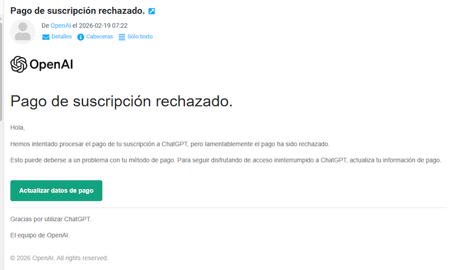 El email que se está recibiendo tiene como asunto “Pago de suscripción rechazado” y como remitente OpenAI, aunque si se accede a la dirección completa se observa que no corresponde a una dirección oficial.