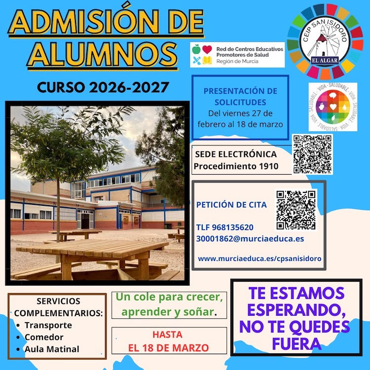 El colegio algareño informa de que hasta el 18 de marzo pueden presentarse las solicitudes de alumnado para el curso 26/27. Para ello es necesario solicitar cita previa y cumplimentar el procedimiento 1910.