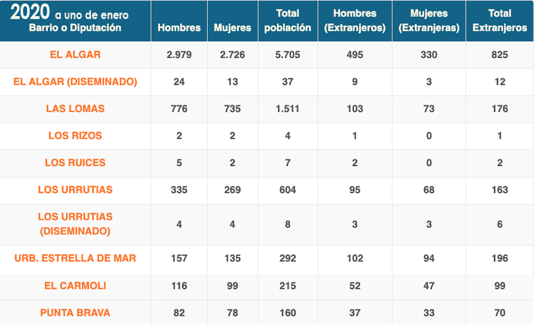 Los habitantes censados en la diputación de El Algar, que incluye la localidad algareña, Los Urrutias y Estrella de Mar, más los residentes en El Carmolí y Punta Brava alcanzan la cifra de 9.567 a fecha uno de enero de este año, cuando en la misma fecha de 2020 la cifra era de 5.250. En ese período, los extranjeros han pasado de 209 a 1.884. Los hombres, diferencia de gran parte del municipio, siguen siendo más que las mujeres.