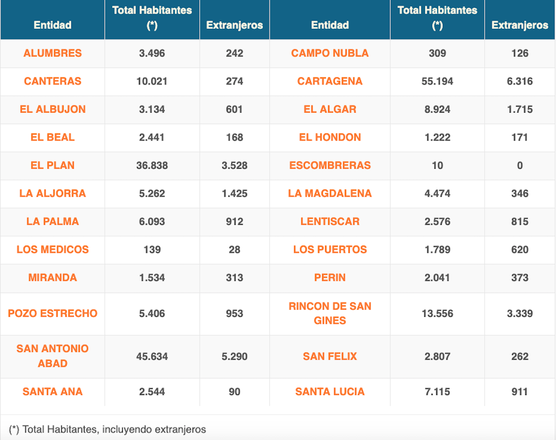 La ciudad, El Plan (Los Dolores y entorno) y San Antonio Abad son los territorios con más residentes. De la zona urbana hay que destacar qu el casco antiguo (desde el paseo de Alfonso XIII y la plaza de España hasta el puerto) la población está en 41.606, con lo que sigue bajando (41.846 tuvo el año anterior) desde que en 2008 se hizo peatonal y se eliminó el colegio de San Miguel. Entonces los residentes eran casi cincuenta mil.