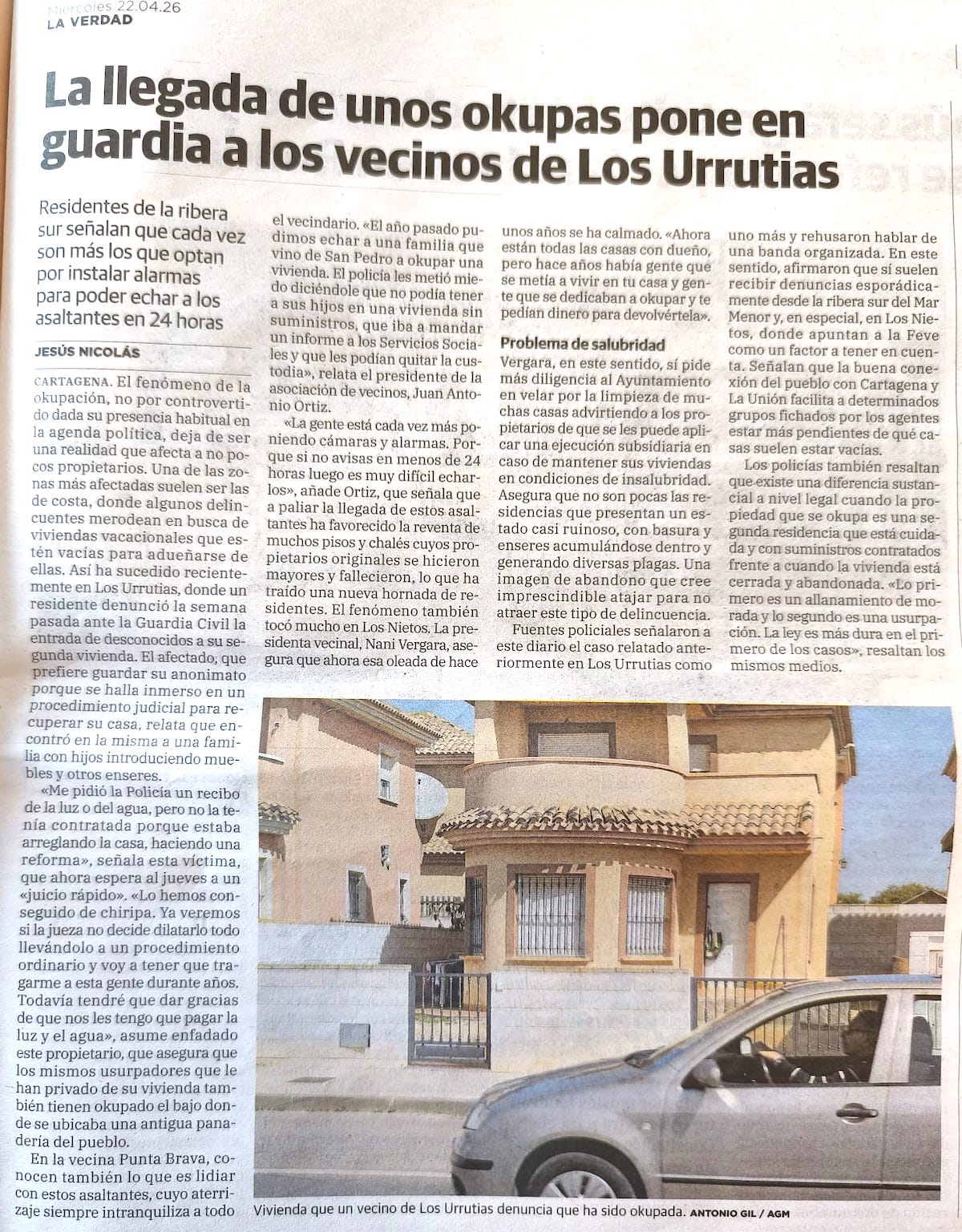 3. El diario La Verdad publica un artículo firmado por Jesús Nicolás titulado: 'La llegada de unos okupas pone en guardia a los vecinos de Los Urrutias', en cuyo subtítulo se puede leer que cada vez son más los que optan por instalar alarmas para poder echar a los asaltantes en 24 horas: pinchar aquí