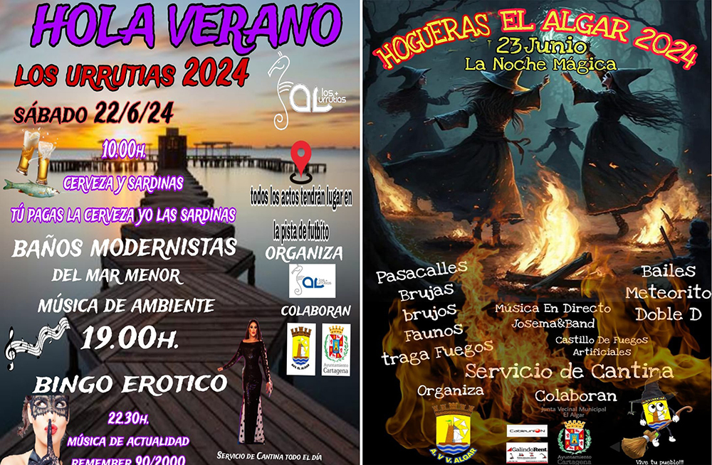 Los Urrutias celebra este sábado su jornada de 'Hola verano' con baños modernistas, sardinada y bingo erótico, mientras que El Algar tiene el domingo una cita con brujas, faunios, bailes y tragafuegos en torno a la hoguera de San Juan. La música también estarán presente en ambas jornadas.