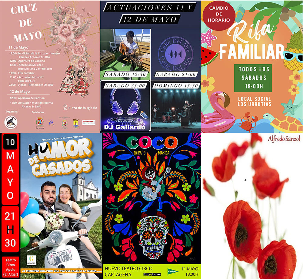 Triple propuesta en el Apolo con humor, musical infantil y teatro, mientras que las 'cruces de mayo' se montan en la plaza de la Iglesia y en el centro cívico. En el deporte, sigue la AD Algar Surmenor compitiendo en el Nacional cadete de voleibol de Asturias, mientras que en fútbol hay 15 partidos para los equipos del CD Algar, incluida la despedida de la Tercera RFEF del primer equipo. En Los Urrutias, sábado tarde para la lotería familiar.