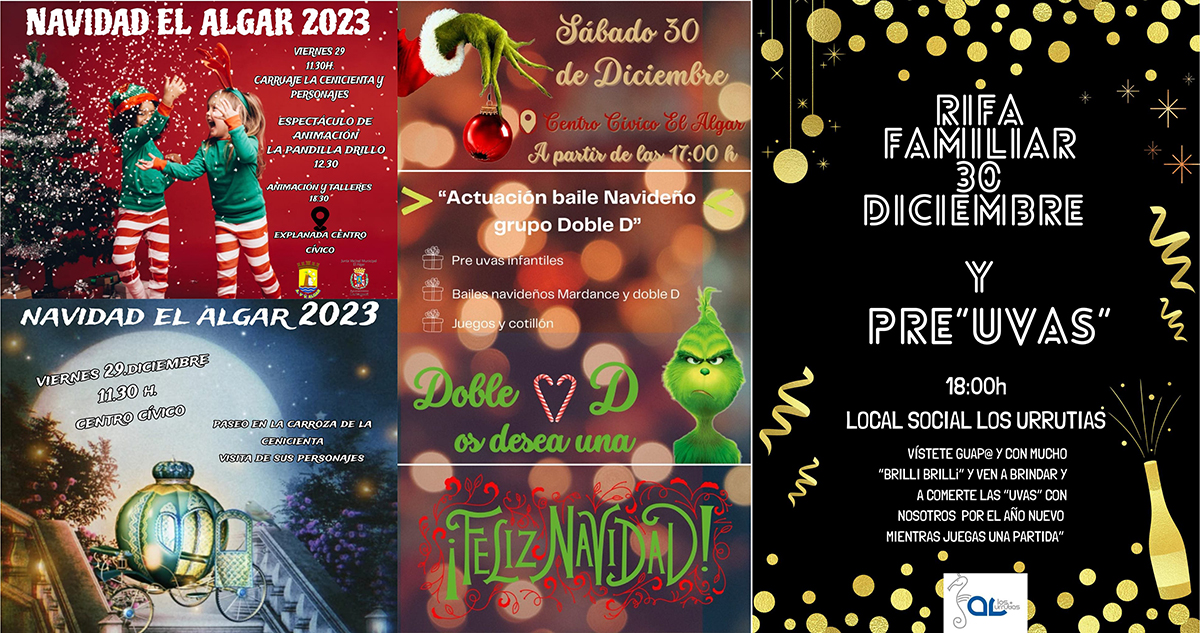 El Algar, además de la gala de magia de esta noche, ofrece para esta mañana paseos en carruaje y la visita de ‘La pandilla ‘de Drilo’, mientras quepor la tarde hay talleres. El sábado cogen el protagonismo (17 horas) los bailes de 'Doble D' y 'MarDance' junto a las preuvas infantiles’, mientras que en Los Urrutias hay rifa familiar y ‘Preuvas’ para despedir el año desde las 18 horas. Por otro lado, ya se puede contactar con el representante de los Reyes Magos en la costa del arco sur del Mar Menor para el reparto de regalos en los domicilios.