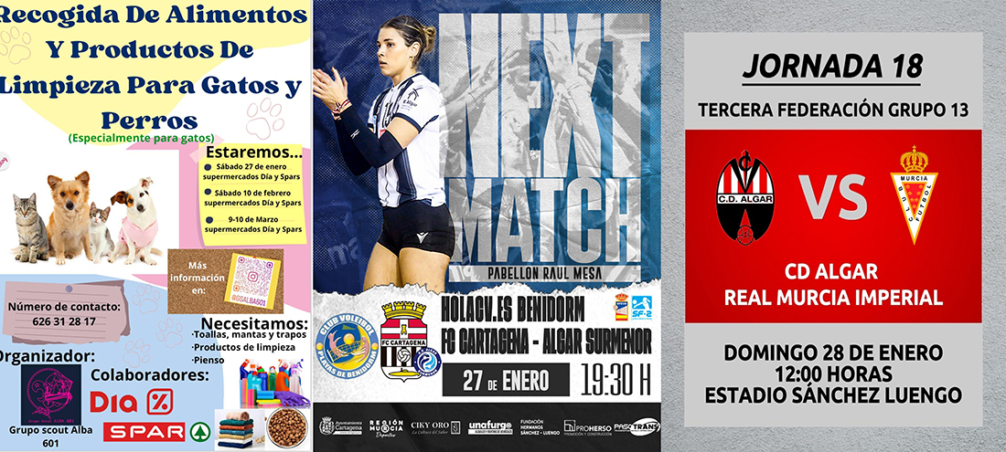 El CD Algar pasa a jugar los domingos por la mañana como local. También ofrecemos horarios de los equipos de base de voleibol y baloncesto. Fuera del deporte, estreno de la cantina del Teatro Apolo y recogida en supermercados de alimentos productos de limpieza para perros y gastos. Además, un sábado más a las 18 horas, rifa familiar en el local social de Los Urrutias.