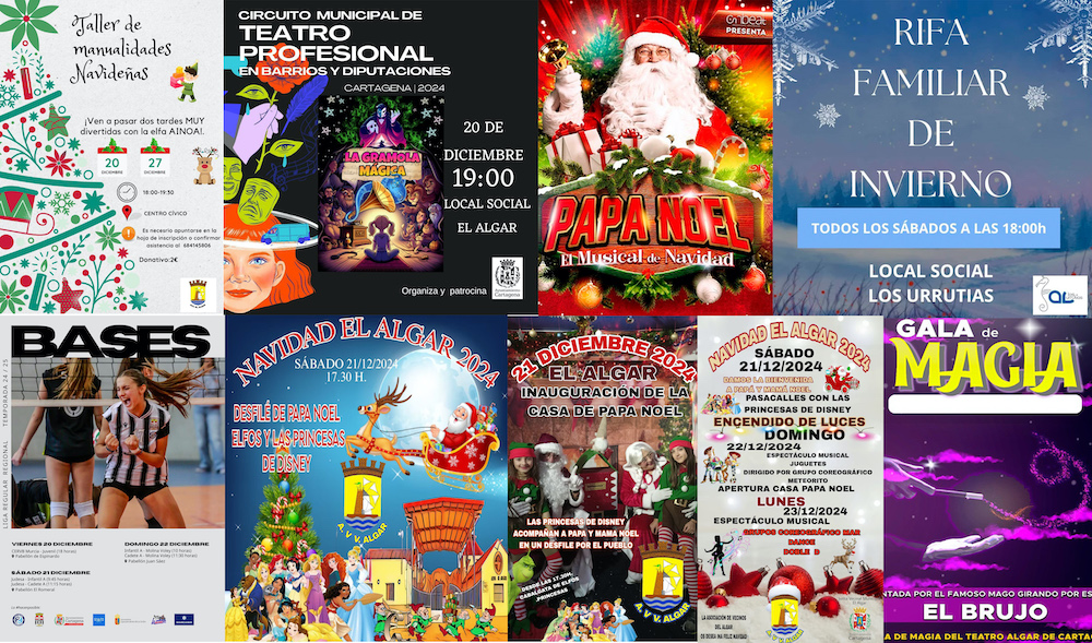 Las actividades navideñas destacan en este fin de semana, especialmente el desfile de Papá Noel con inauguración de su casa, además del espectáculo musical de 'Meteorito', entre otras propuestas, como las que ofrece el Teatro Apolo o las que tienen lugar esta tarde con manualidades y teatro infantil. En Los Urrutias hay rifa familiar y en deportes juega el sábado el CD Algar de fútbol y afrontan sus últimos partidos del año 2024 los equipos federados del Club Baloncesto Sierramar y del Algar Surmenor de voleibol femenino.
