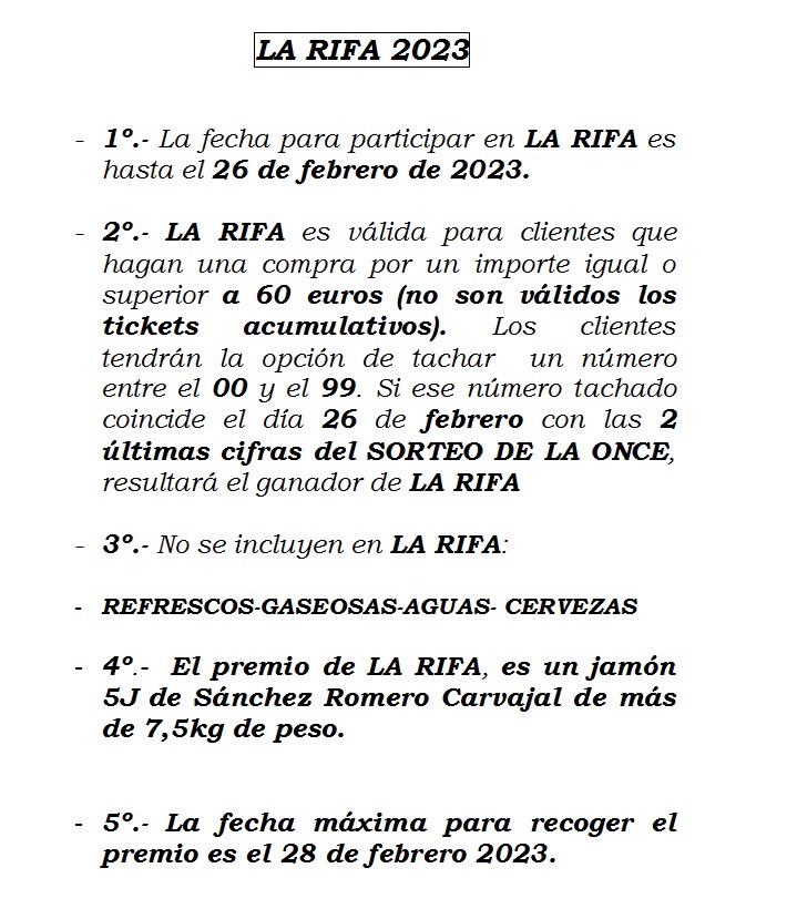 Un ‘5J’ de Sánchez Romero Carvajal de más de siete kilos y medio de peso. Lo puedes conseguir con la rifa que organiza ‘Mar de vinos’, la bodega del Mar Menor, teniendo la opción de elegir uno de los 100 números al efectuar una compra superior a 60 euros en el establecimiento de Los Urrutias. Si el número elegido coincide con las dos últimas cifras del sorteo de la ONCE del 26 de febrero, este más que sabroso premio será tuyo.