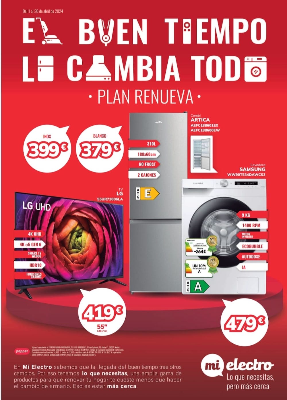 El establecimiento de ‘mi electro-RCM’ de la avenida de Filipinas de El Algar (Cartagena) activa un ‘plan renueva’ porque sabemos que la llegada del buen tiempo trae otros cambios. Por eso, tenemos lo que necesitas, una amplia gama de productos para que renovar tu hogar te cueste menos que hacer el cambio de armario. Eso es estar más cerca.