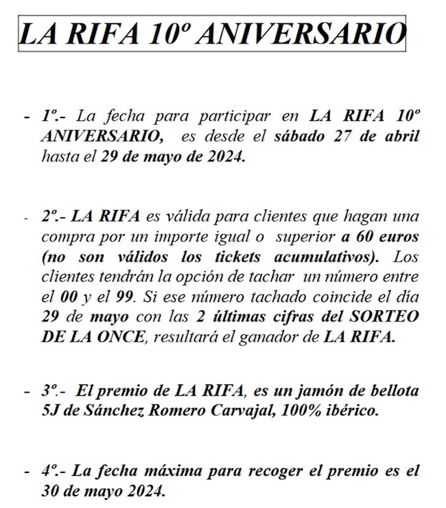 Mar de Vinos, situada en Los Urrutias, celebra su décimo aniversario con el sorteo de una paleta de bellota 5J de Sánchez Romero Carvajal, cien por cien ibérico. Son cien los números (del 0 al 99) que se repartirán en la rifa, siendo necesario para participar efectuar compras de un importe igual o superior a los 60 euros. El ganador será el que tenga el número que forman las dos cifras finales del sorteo dela ONCE del 29 de mayo.