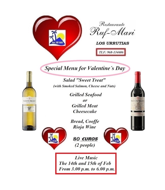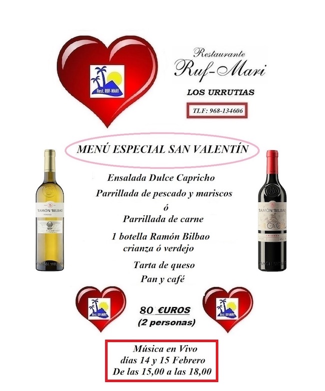 Restaurante Ruf-Mari te propone celebran San Valentín hoy o mañana con un menú especial en su establecimiento hostelero de Los Urrutias, en una cita que estará enriquecida por música en vivo. Si estáis enamorados, no os lo podéis perder.