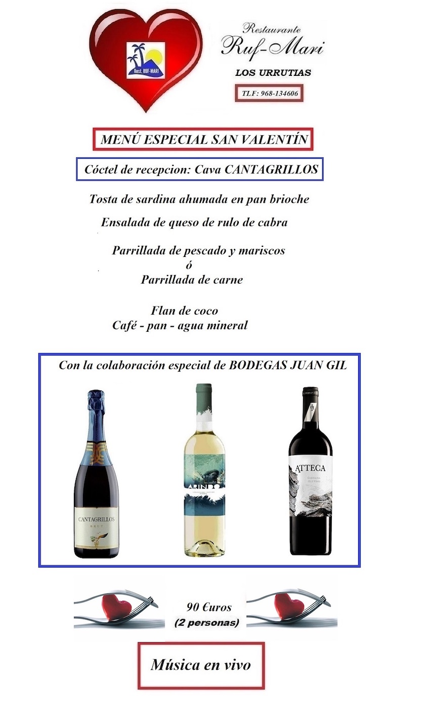 El restaurante del Mar Menor prepara un San Valentín especial para parejas con cóctel de recepción, música en vivo y un menú compuesto por tosta de sardina ahumada en pan brioche, ensalada de queso de rulo de cabra, parrillada de pescado y marisco o parrillada de carne, flan de coco, café, pan y agua mineral, con la colaboración de vinos de Bodegas Juan Gil. Cuesta sólo 90 euros para dos personas. Reserva ya.
