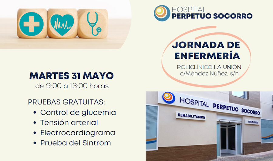 El martes 31 de mayo, el Policlínico Perpetuo Socorro de La Unión celebra la ‘Jornada de la Enfermería’. En horario de 9 a 13 horas, se realizarán a los vecinos de esta ciudad y de las poblaciones del entorno, como El Algar, pruebas gratuitas de glucemia, electrocardiograma, control de tensión arterial y prueba de sintrom. Desde la dirección del centro invitan a todos los vecinos de La Unión y alrededores a que dediquen unos minutos a revisar su salud antes del verano.