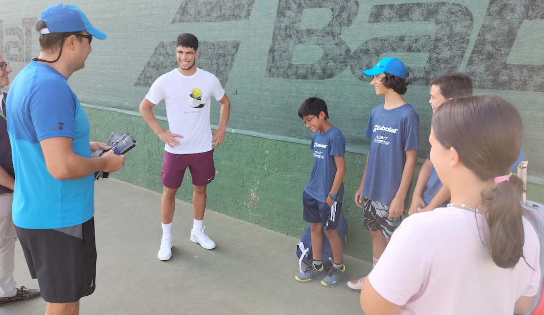 El reciente campeón del gran torneo de Wimbledon británico y número 1 del mundo entrenó bajo la atenta mirada de los participantes del campus organizado por ELIS Murcia e impartido por 'MET Carlos Alcaraz Tennis Academy by Reina'. En la foto, conversa y bromea amigablemente durante el campus.