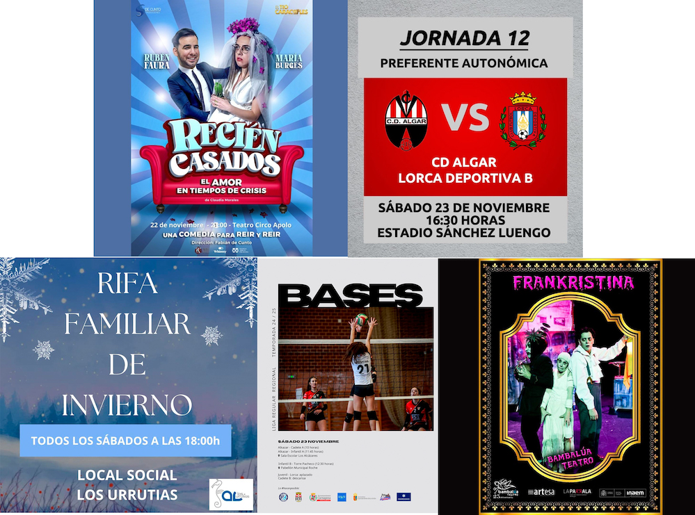 Doble propuesta teatral en el Apolo con temática humorística a lo que se suman la rifa familiar de Los Urrutias y la agenda deportiva. En fútbol, el CD Algar recibe al Lorca este sábado, día en el que el primer equipo del Surmenor visita Tenerife, mientras que tienen partidos de liga tres de sus secciones de base. En baloncesto, dos partidos del CB Sierramar se juegan en el pabellón Juan Sáez.