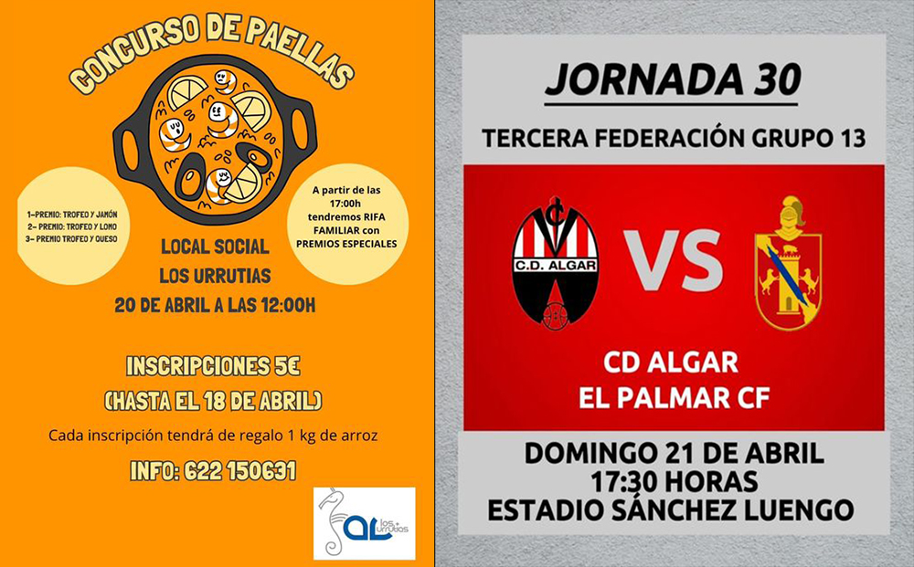 El sábado es para el popular concurso de arroces en el patio del local social de Los Urrutias a partir de las 12 horas y para la mayoría de los partidos que afronta en esta jornada el Club Baloncesto Sierramar. El domingo llegar otro crucial encuentro del CD Algar en Tercera RFEF, club que también tiene compromisos de liga para quince de sus equipos de categorías de base.