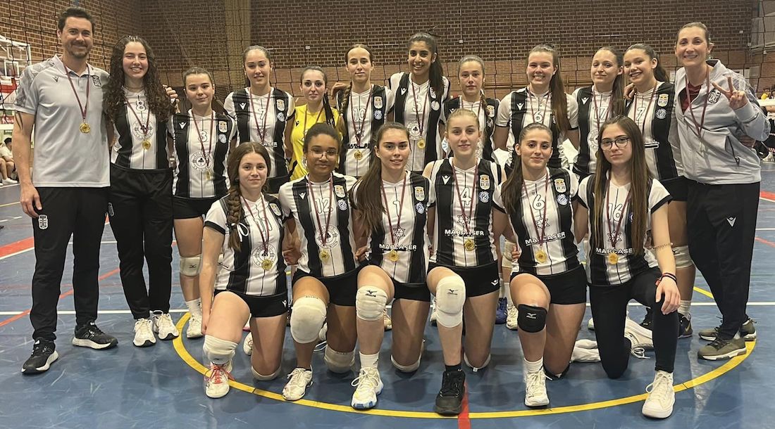 El equipo algareño derrotó por el mismo marcador de 3-0 al CD Judesa en semifinales y al CV Playas Cartagena Rojo en la final y volverá a representación a la comunidad autónoma en el campeonato de España de voleibol femenino de esta categoría. En la foto, las jugadoras con las medallas entre los técnicos André Collin y Sandra Cegarra.