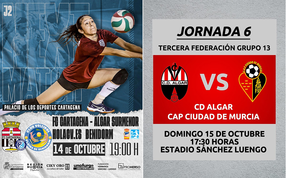 Los equipos de la AD Algar Surmenor y CD Algar afrontan sus partidos como locales en Cartagena y El Algar, respectivamente. También hay compromisos para las categorías de base de voleibol femenino, fútbol y baloncesto. Fuera del deporte, donde cita en el Apolo con un musical y una tarde de mentalismo. Además, rifa familiar el sábado a las 19 horas en el local social de Los Urrutias. Hay que añadir que el grupo 'Meteorito' de El Algar actúa este sábado (19.30 horas) en las Fiestas del Rosario de La Unión.
