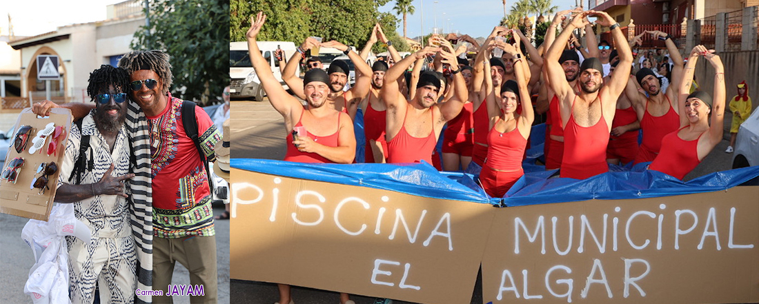 El sábado se celebró la simpática marcha de las fiestas de El Algar en la que grupos y particulares cruzan el pueblo con simpáticos vestuarios, que en esta ocasión fueron desde el 'top manta' hasta 'los piscineros' de la ausente piscina municipal. El cortejo fue cerrado por la carroza con la corte real.