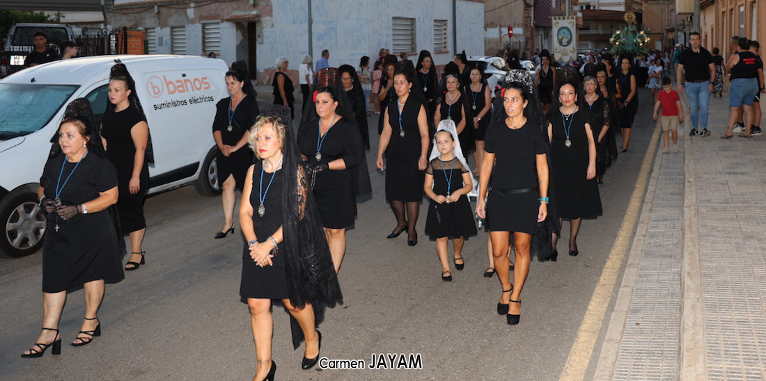 Nuestra Señora de los Llanos volvió a salir en procesión por su pueblo de El Algar por cuarto año consecutivos tras el triple paréntesis de entre 2019 y 2021 debido a la lluvia y a la pandemia. Una formación cada vez más amplia de 'manolas' abrió paso a la patrona.