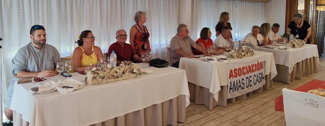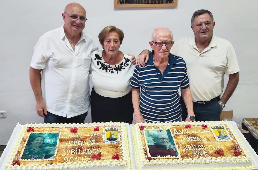 El matrimonio formado por José Saura y Pilar 'La del Rape', a quienes se observa en el centro, detrás de dos grandes tartas cartageneras personalizadas, fueron homenajeados en la tradicional merienda que organizan las asociaciones de vecinos y de mayores del pueblo. Este acto estuvo encuadrado en el tradicional homenaje al jubilado que se desarrolló en el centro multiusos.