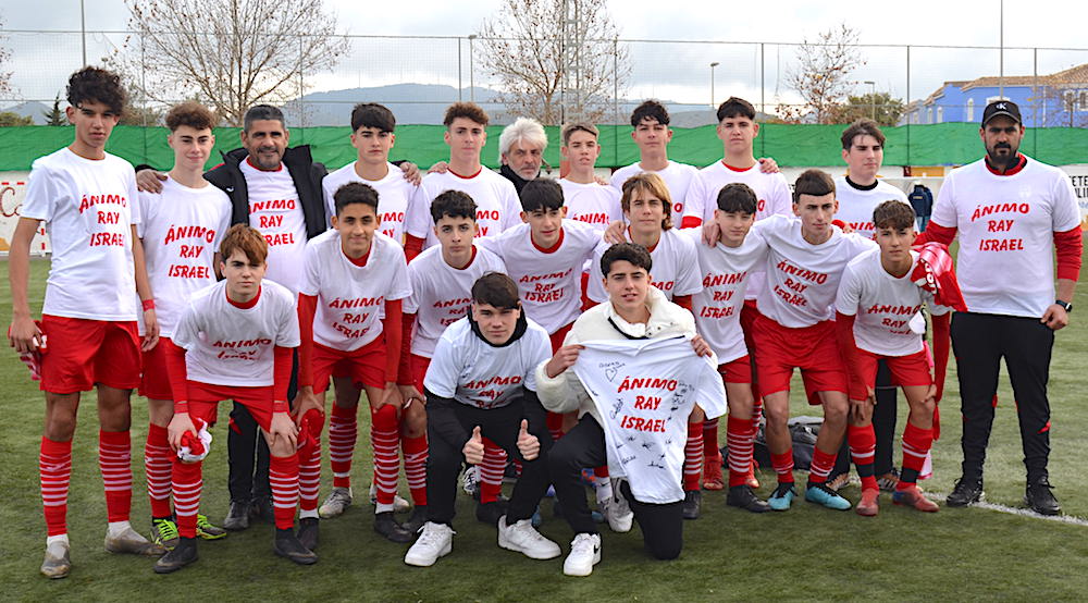 Israel y Ray, a quienes se observa agachados, en primer plano, de la foto superior, sufren lesiones de larga duración que impedirán que puedan volver a jugar al fútbol esta temporada. Ante esa situación, sus compañeros y entrenador (Alberto Ortas) del cadete del CD Algar han querido animarlos luciendo camisetas de apoyo.