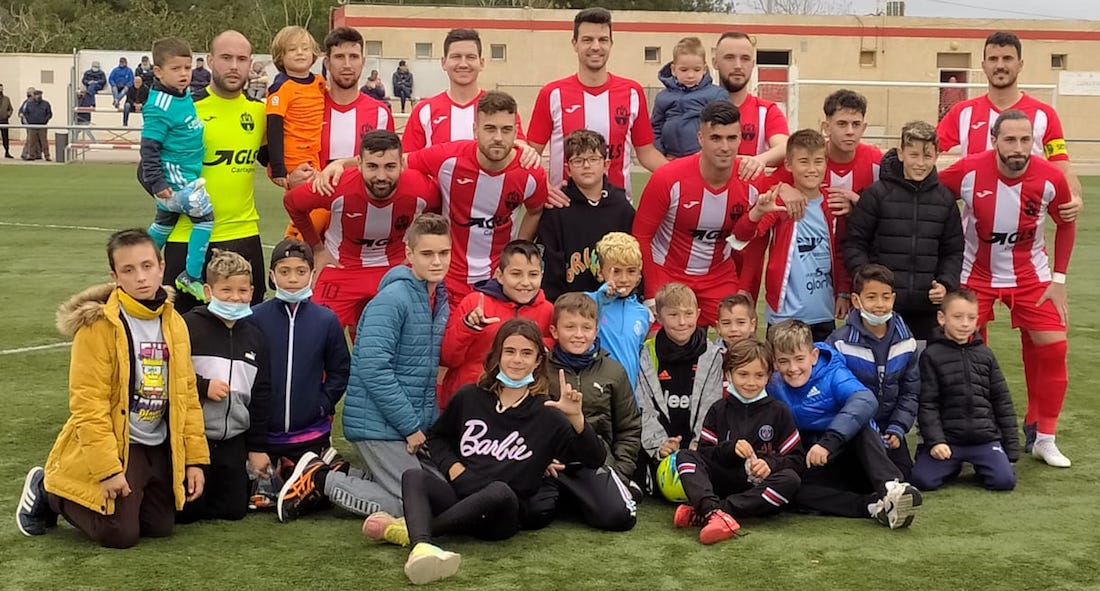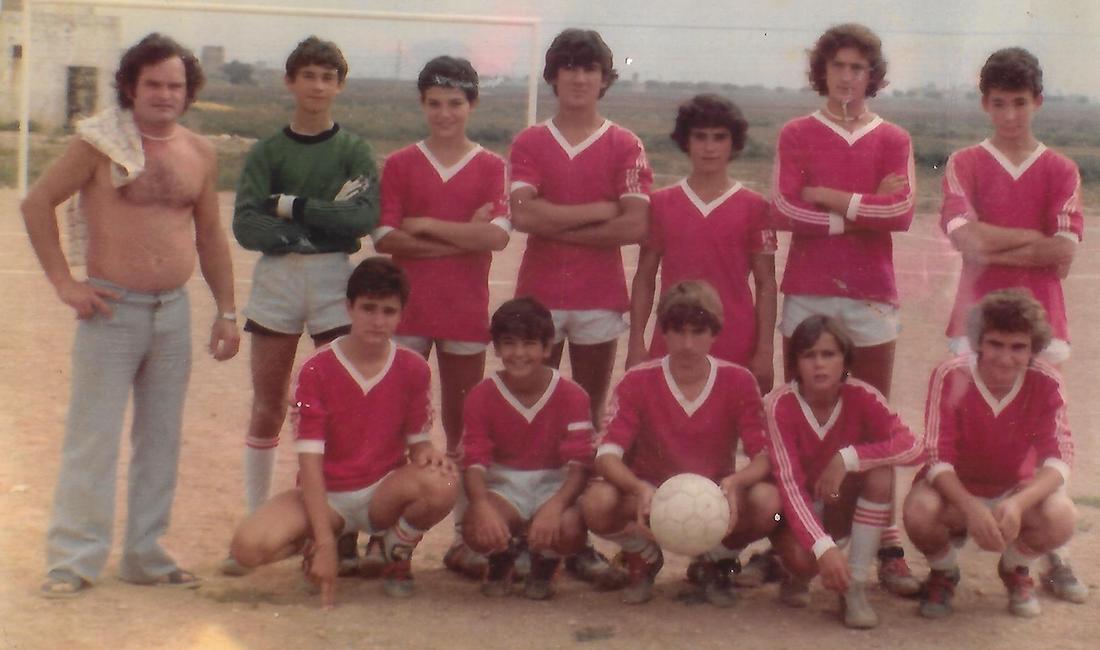 Foto de los años sesenta del siglo XX en las instalaciones del Sánchez Luengo de El Algar, cuando estos terrenos, que aún estaban sin vallar, se denominaban ‘Las viñas’ y habían sido cedido para la práctica deportiva local. Estos futbolistas eran de edad infantil, que se juntaban para jugar y entre los que estaba Palomeque, segundo de pie por la derecha del lector, y que llegó a alcanzar el fútbol profesional.