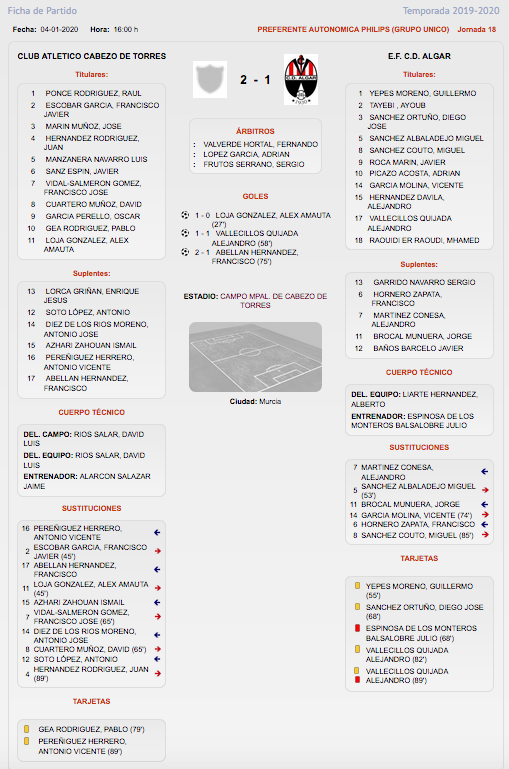 El equipo rojiblanco salda con una derrota en el campo del Club Atlético Cabezo de Torres su primer partido de 2020 en Preferente, en el que sufre dos expulsiones.
