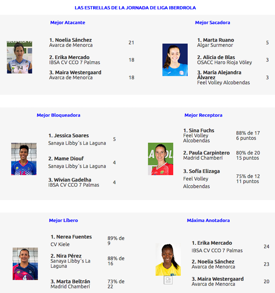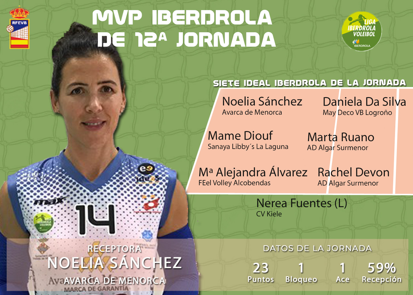 Por su parte, la receptora de Avarca de Menorca Noelia Sánchez repite como MVP Iberdrola de la jornada. La monfortina cerró 2019 con el galardón individual y abre 2020 repitiendo honores. La receptora gallega sumó 23 puntos, 21 en ataque con un bloqueo y un saque directo para ser decisiva en la victoria de las baleares en la pista de DSV CV Sant Cugat, remontada incluida.