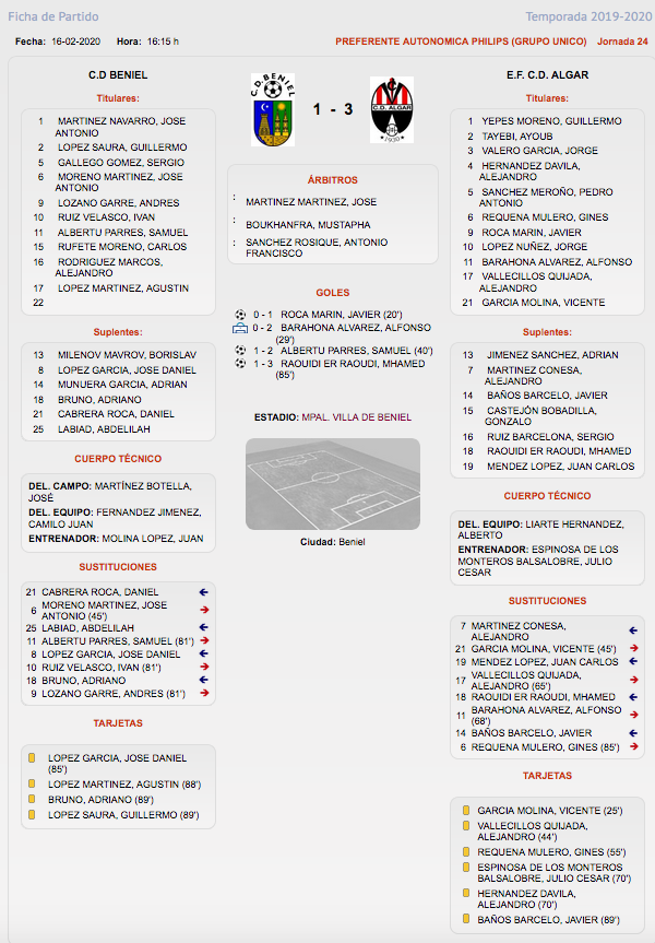 El CD Algar consigue su tercera victoria consecutiva y sigue escalando puestos en la clasificación general. Los jugadores que dirige el técnico Julio César Espinosa dieron una gran lección de lucha y de futbol en el Villa de Beniel, y merced a ese afán de ganar el encuentro se vio recompensado con un gran triunfo consiguiendo su tercera victoria seguida, y que le viene muy bien y con la moral por todo lo alto para recibir el próximo domingo al líder de la categoría, el Rácing Murcia.