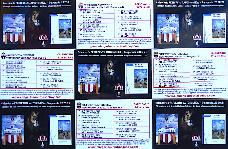 José Antonio Martínez Mellinas y el periódico www.elalgarlosurrutiasdehoy.com vuelven, un año más, a regalar a los vecinos con el programa de partidos del club rojiblanco en la nueva temporada en Preferente. Para conseguirlo, basta con pedírnoslo o pasar por la tienda Mi Movil Online. Las competiciones autonómicas parece que se retrasarán con la llegada del nuevo 'Estado de alarma' y de las medidas añadidas a nivel autonómico, pero es una medida que todavía no es oficial. Si fuera así, el orden de los partidos de los calendarios se mantendrá cuando se pueda iniciar la liga.