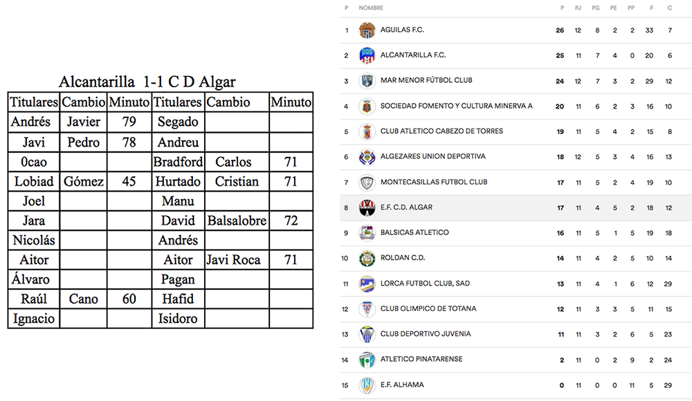 Muy bien el club algarense, que ha saldado una salida complicada con un punto al campo ‘Ángel Sornichero’ de Alcantarilla, pero que se viene con un sabor agridulce, “pues tenemos la sensación de se nos han escapado dos puntos, ya que hemos dominado en machas fases del encuentro con clara ocasiones para habernos llevado los tres puntos”, expresa su entrenador, Julio César Espinosa.