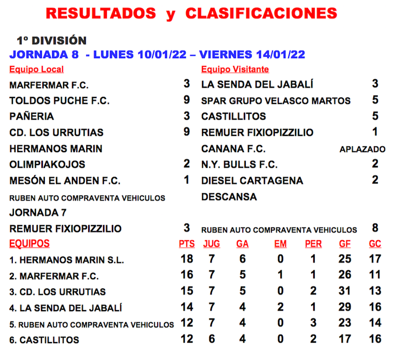 La pasada semana se reanudó el campeonato de la liga local de fútbol aficionado tras el descanso por las vacaciones de Navidad, con la disputa de la octava jornada de competición. En primera división, a pesar de no disputar su partido Hermanos Marín S.L. por aplazamiento, sigue primero con 18 puntos seguido de Marfermar F.C. con 16 puntos, que empataba su encuentro (3-3) contra la Senda del Jabalí. En tercer lugar, situamos al CD Los Urrutias con 15 puntos. Organiza el campeonato la concejalía de Deportes y cuenta con la colaboración de la Asociación de Árbitros de Cartagena, entre otras entidades.