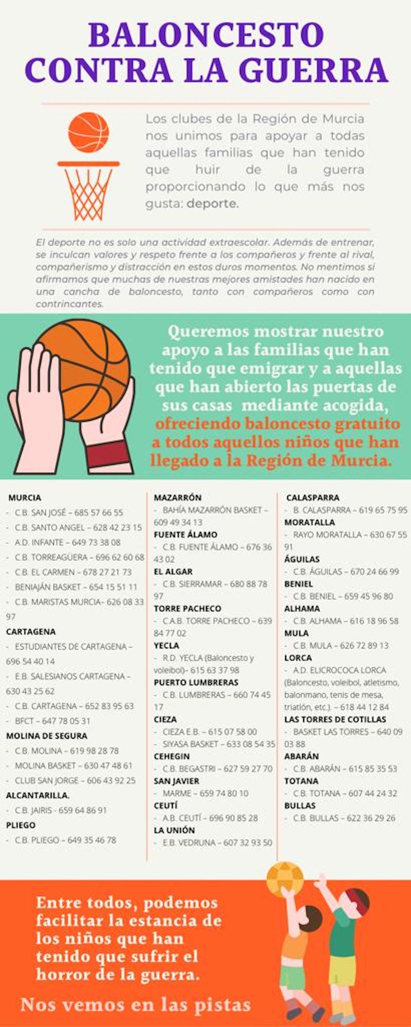Los clubes de la Región de Murcia se unen para apoyar a todas aquellas familias que han tenido que huir por la guerra generada por Rusia ofrecen que los pequeños de Ucrania que han llegado a nuestra tierra jueguen a este deporte de forma gratuita en los clubes de su zona de nueva residencia, que en el caso de El Algar es el CB Sierramar.