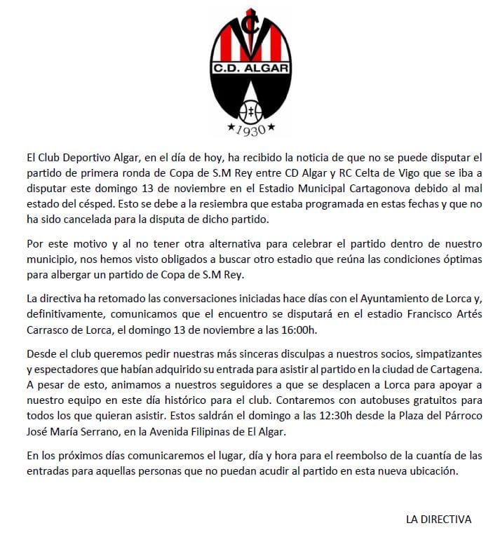 La junta directiva del club rojiblanco ha emitido un comunicado para explicar a aficionados y vecinos el motivo por el que el partido copero frente al Celta se jugará en Lorca este domingo.
