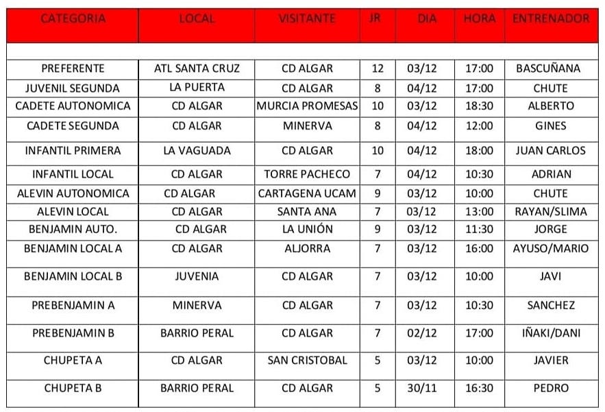 Horarios de los partidos de los equipos de base del Club Deportivo Algar de fútbol y de la Agrupación Deportiva Algar Surmenor de voleibol femenino.
