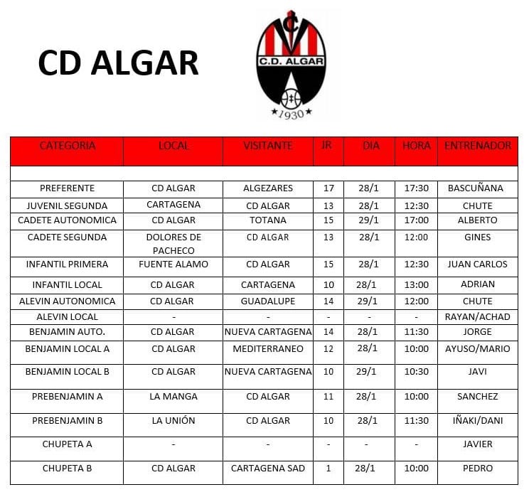Horarios, días y rivales de los compromisos de los equipos del CD Algar de fútbol y CB Sierramar de baloncesto, además de El Algar-La Unión de voleibol, cuyo equipo cadete (foto adjunta) jugó anteayer el partido aplazado de la jornada 11 con victoria sobre Playas de Cartagena (3-0).