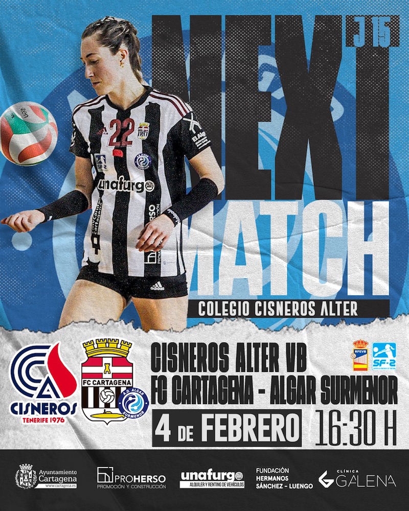 El partido entre el FC Cartagena – Algar Surmenor y Cisneros Alter VB se disputará el sábado 4 de febrero a la 16:30 (hora canaria) en el Colegio Cisneros Alter. El encuentro se podrá seguir en directo a través del streaming de la RFEVB y en las redes oficiales del club.