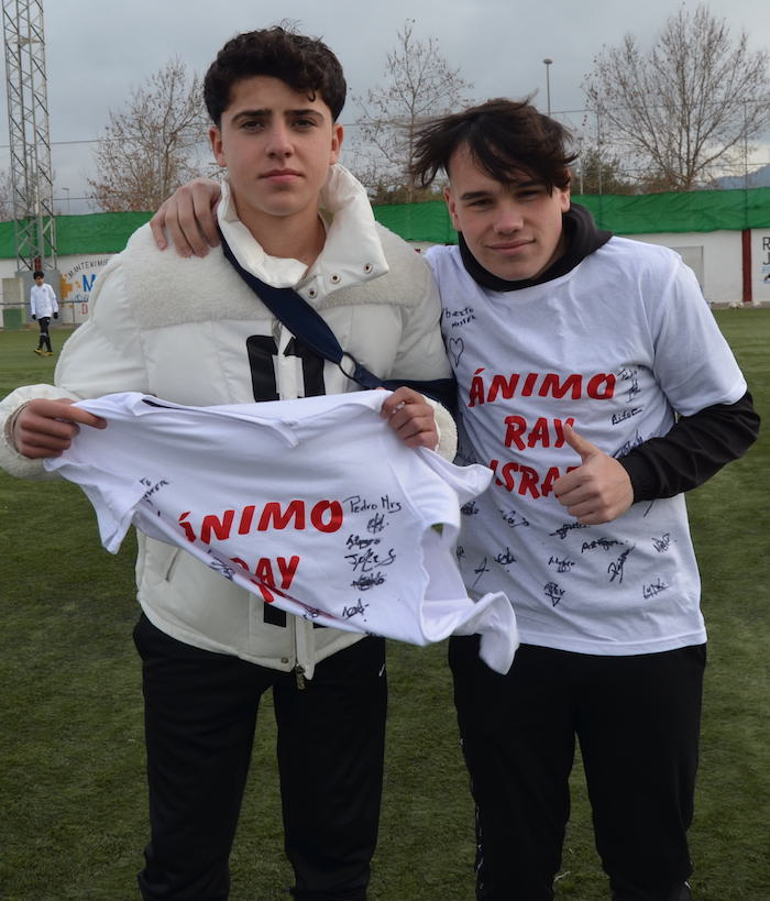 Israel y Ray, a quienes se observa agachados, en primer plano, de la foto superior, sufren lesiones de larga duración que impedirán que puedan volver a jugar al fútbol esta temporada. Ante esa situación, sus compañeros y entrenador (Alberto Ortas) del cadete del CD Algar han querido animarlos luciendo camisetas de apoyo.