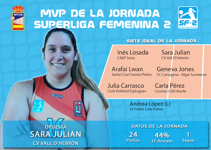 La jugadora del FC Cartagena-AD Algar Surmenor ha sido la mejor bloqueadora de la última jornada de la categoría de plata del voleibol nacional español femenino y ha sido incluida en el siete ideal.
